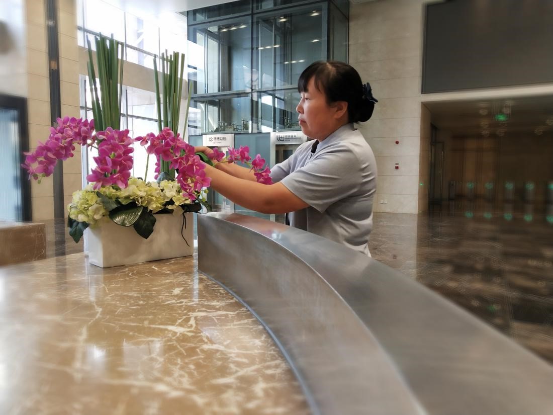 保潔人員以超高的標(biāo)準(zhǔn),用精細(xì)的服務(wù),為寫字樓的每一處地面每一道風(fēng)景提供衛(wèi)生保障