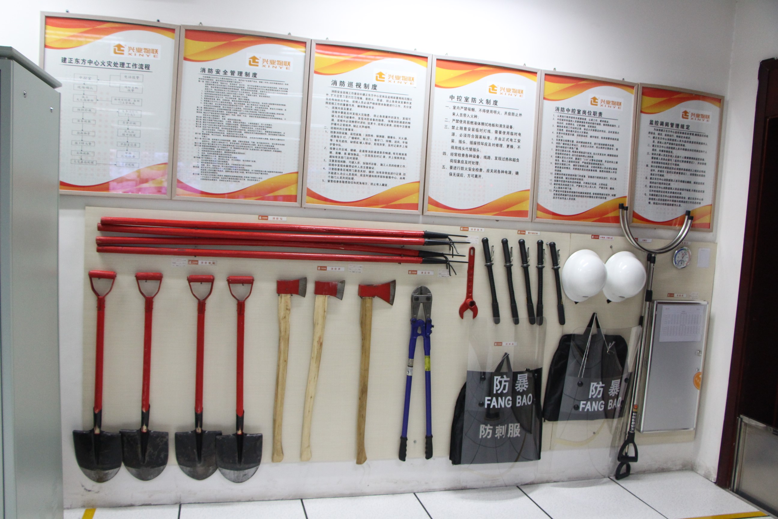 消防、防暴器材存放區(qū)域,物品名稱、規(guī)格標(biāo)識(shí)清楚。
