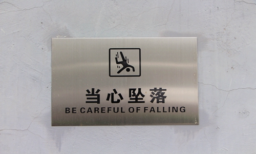 頂層休息區(qū)“當心墜落”標牌圖示、中文、英文標識