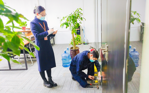這天下午,正商國際廣場客戶服務(wù)中心阮珍接到業(yè)主來電:“房間入戶門需要幫忙維修”,阮珍趕緊聯(lián)系工程部宋師傅一起入戶查看,原來是門角的合頁五金被外力折斷,整個木門搖搖欲墜。