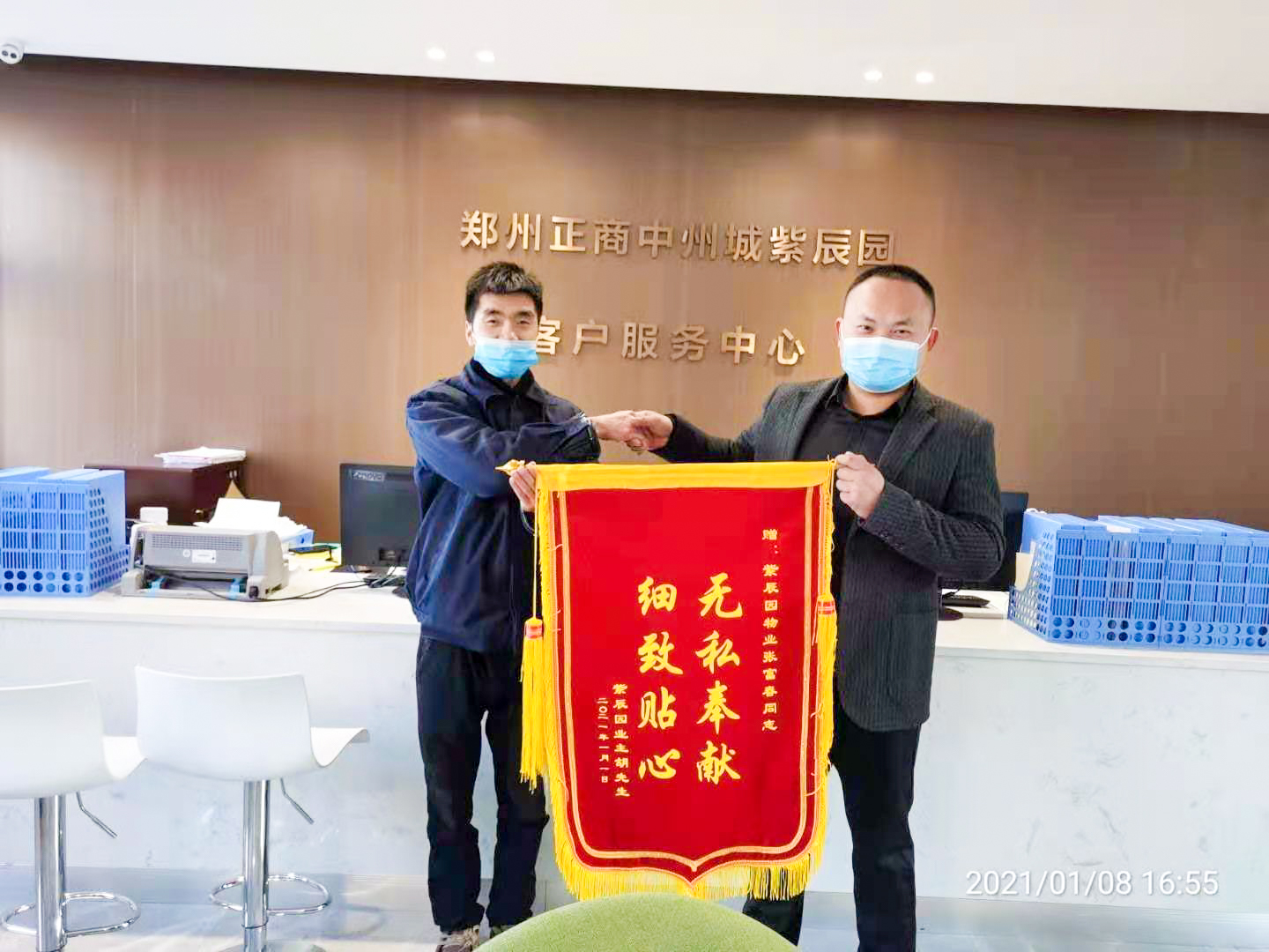 3天后,胡先生帶著錦旗到客服中心向物業(yè)和張師傅表達感激之情,對于正商中州城紫辰園服務(wù)中心這種真誠的工作態(tài)度,大為贊賞。