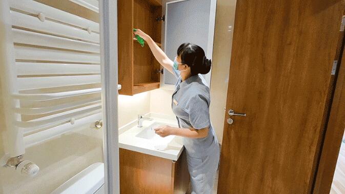 在交房的兩個月前,保潔團(tuán)隊就已進(jìn)駐園區(qū),對公區(qū)和1000多戶精裝房內(nèi)窗縫、玻璃、吊頂處、櫥柜、地板等進(jìn)行擦拭除塵。