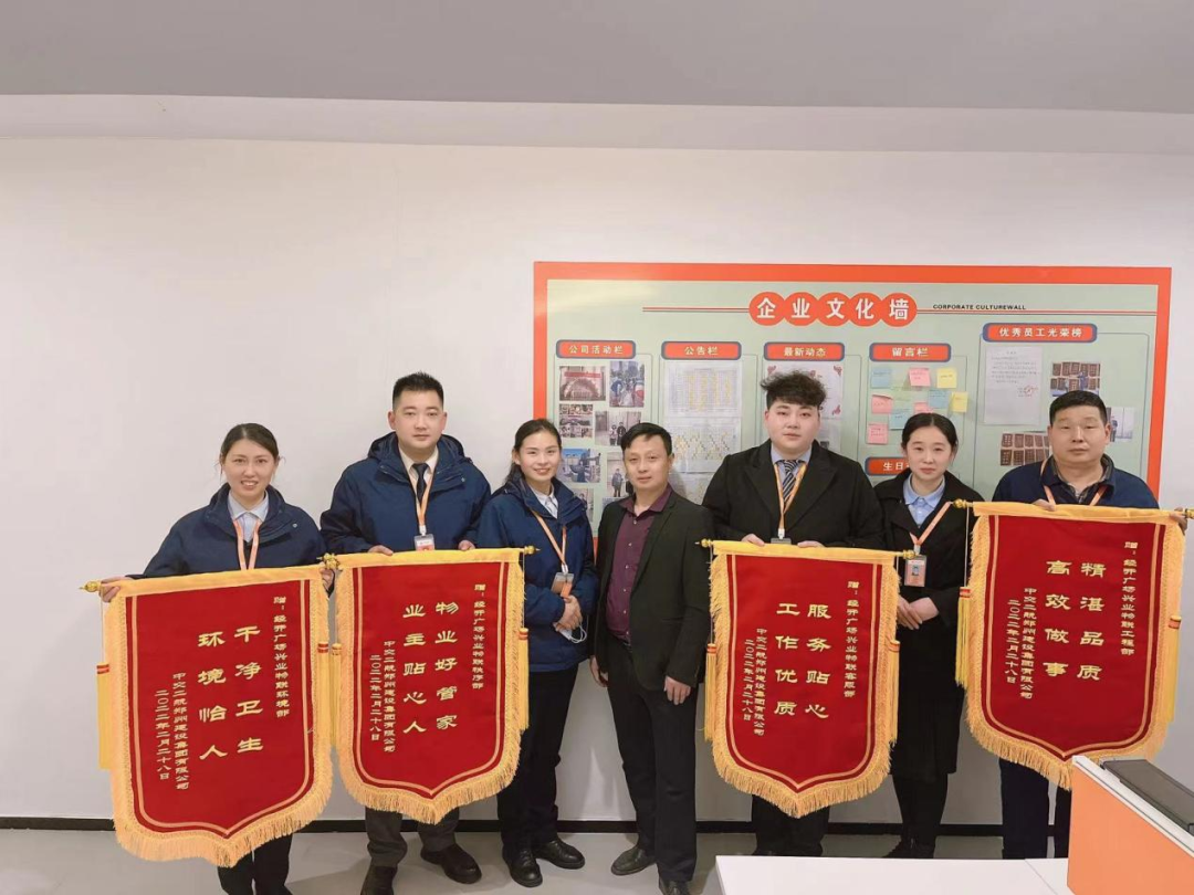 “做好一件小事很容易,做好每一件小事很難,你們能把毛坯房打理得干凈整潔,也更加堅(jiān)定了我們的選擇?!毖b修完畢后,中交負(fù)責(zé)人親自到物業(yè)中心送了4面錦旗,分別對(duì)客服、工程、環(huán)境、秩序部表示感謝!
